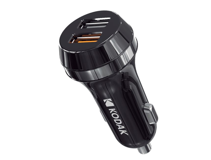 Автомобильное зарядное устройство "KODAK", 2 USB-порта, 1 USB порт быстрой зарядки Qualcomm Quick Charge 3.0, 1 USB порт 5 В/2.4 А, постоянное напряжение на входе: 12-24 В. напряжение и сила тока на выходе: 5 В/3,0 A, 9 В/2,0 A, 12 В/1,5 A,