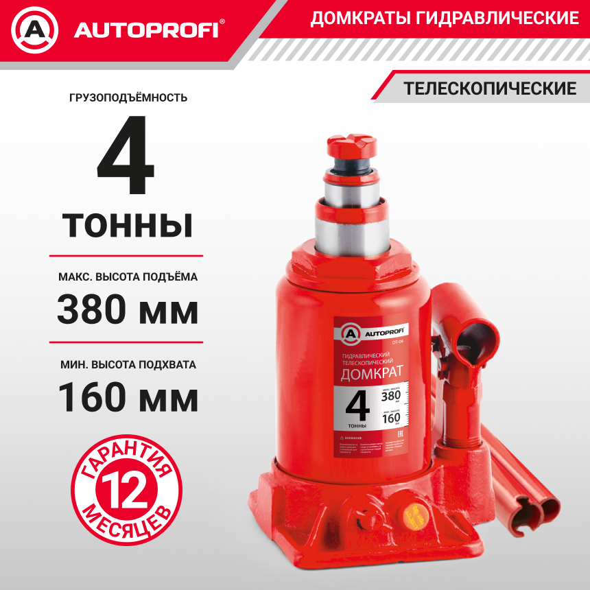Домкрат бутылочный AUTOPROFI, гидравлический, телескопический, 4 тонны, защита от перегруза, высота подъёма 160 - 380 мм.