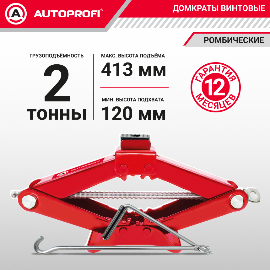 Домкрат ромбический AUTOPROFI, механический, винтовой, 2 тонны, высота подъёма 120 - 413 мм., с резин. опорной частью