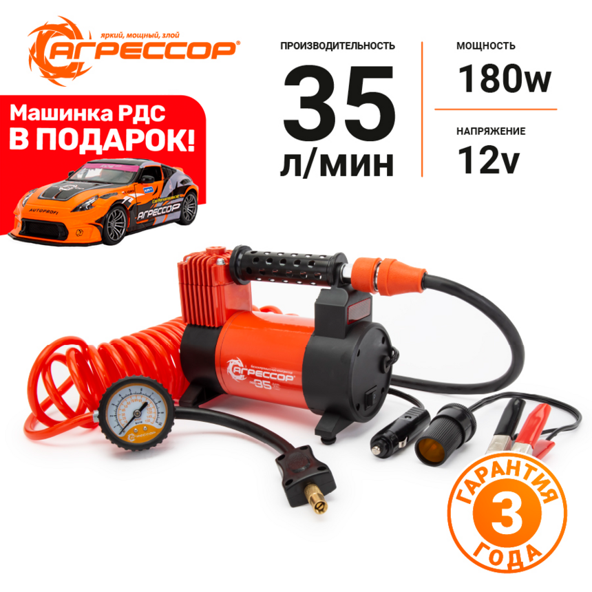 Компрессор воздушный АГРЕССОР, 35 л./мин., 12V/14A, 180W, 10 Атм., съёмный шланг 5 м., клапан для регулир. давления, питание от прикуривателя, переходник с зажимами АКБ, набор из 4-х переходников для надувн. изделий, сумка