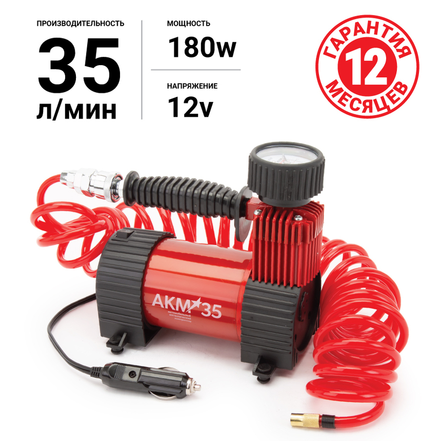 Линейка компрессоров AUTOPROFI серия АКМ - это новый дизайн, хорошая производительность, и комплектация, включающая в себя все необходимое. Металлический корпус и цельнометаллический поршневой насос на всех компрессорах линейки АКМ. Компрессор АКМ-35 оборудован защитой от перегрева, точным двушкальным манометром, быстросъемным шлангом, кабелем питания 3 метровой длины и удобной сумкой для хранения и переноски. Компрессор позволяет полностью удовлетворить ожидания потребителей, которые ищут «ЗОЛОТУЮ СЕРЕДИНУ», при этом оставаясь полноценными компрессорами для накачивания шин автомобилей, велосипедов и других надувных изделий.