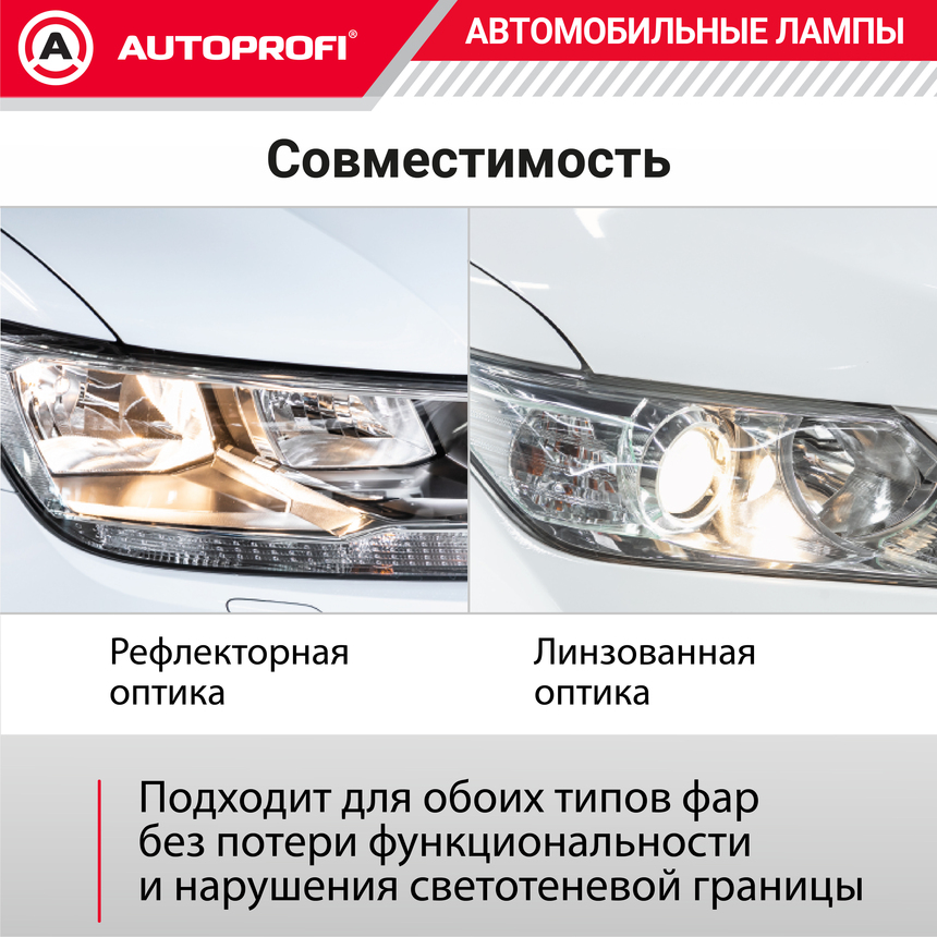 Компания AUTOPROFI выводит на рынок лампы с мощностью соответствующей требованиям автопроизводителей, при этом, модели серий PERFORMANCE (+80%) дают более мощный световой поток только за счет использования смеси благородных газов в колбе и правильно подобранной толщины спирали накала. Кварцевое стекло ламп AUTOPROFI защищает автомобильную фару изнутри от ультрафиолетового излучения. ЭТО ЗНАЧИТЕЛЬНО ПРОДЛЕВАЕТ РЕСУРС дорогостоящих фар современного автомобиля. Фары дольше сохраняют прозрачность, тем самым, делая езду в тёмное время суток – безопасной.