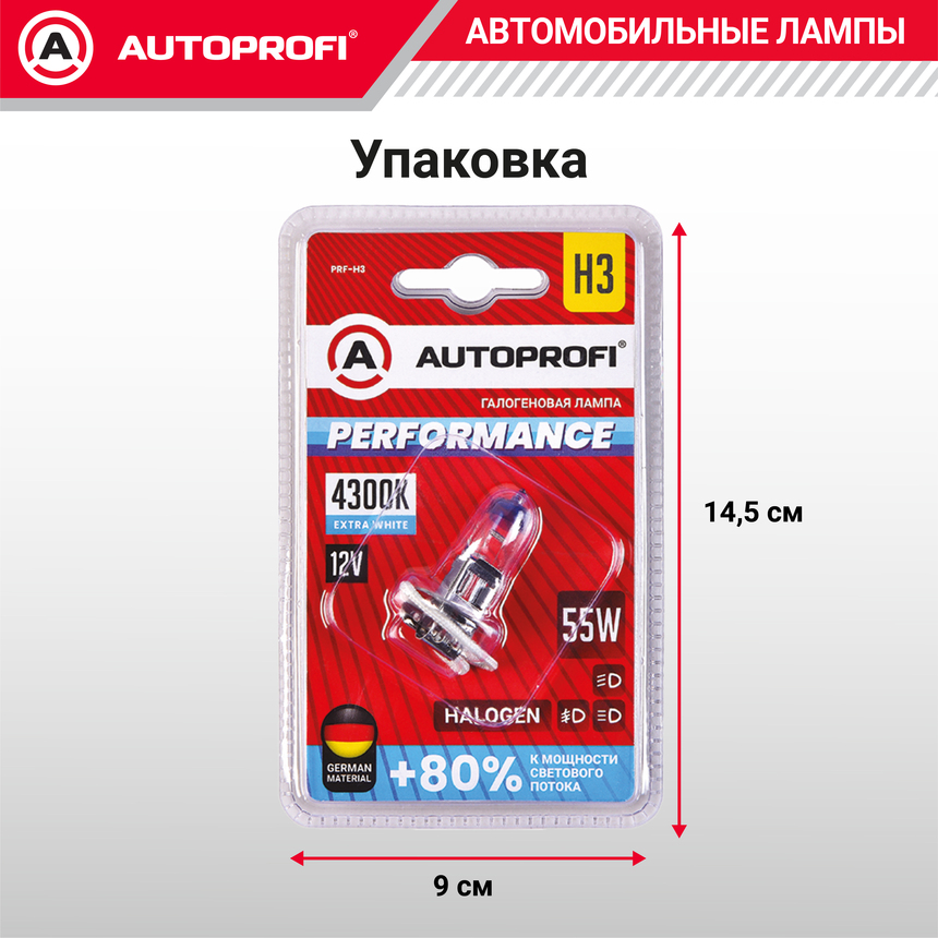 Линейка галогеновых ламп AUTOPROFI PERFORMANCE - лампы с улучшенными техническими характеристиками и световым потоком на 80% мощнее чем у стандартных галогеновых ламп. Расчетный срок службы в трое превышающий обычные лампы. Специальное нанесение на колбу обеспечивает более белый спектр свечения (4300К).