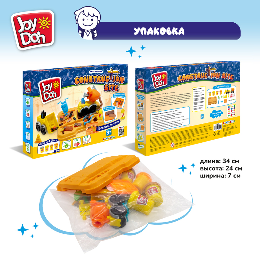 Масса для лепки Joy Doh, набор CONSTRUCTION SITE - БОЛЬШАЯ СТРОЙКА, строительная площадка, 2 спецтехники, пресс-формы инструментов и огрождений, 4 баночки с тестом, (4 x 56 г.)