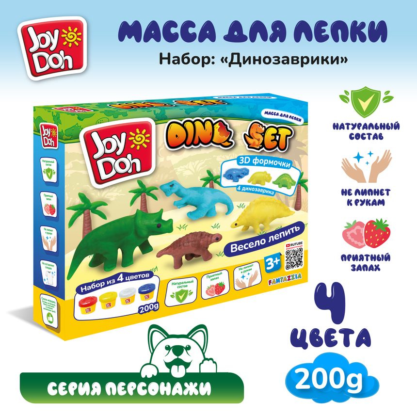 Масса для лепки Joy Doh, набор DINO SET - ДИНОЗАВРИКИ, 3d формы , 9 аксессуаров, 4 баночки с тестом, (4 x 50 г.)