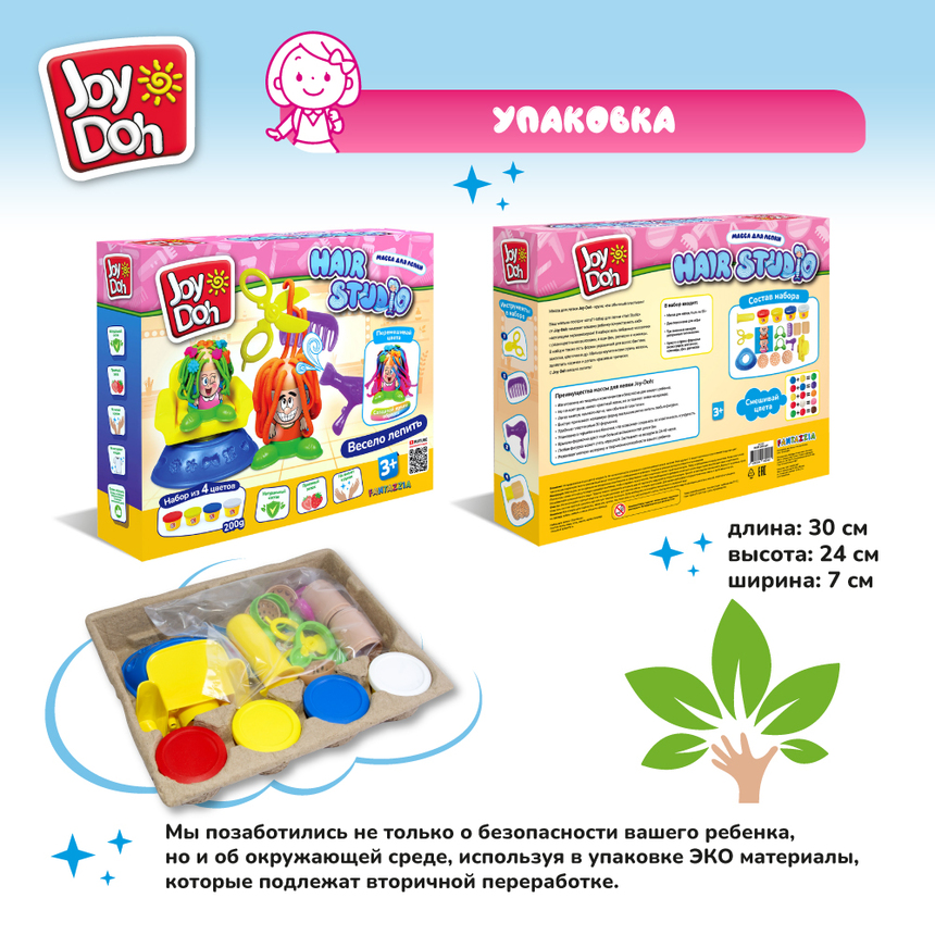 Ваш малыш постриг кота? Набор для лепки «Hair Studio» от Joy-Doh поможет вашему ребенку почувствовать себя настоящим парикмахером! В наборе есть забавные человечки с разноцветными волосами, а еще фен, расческа, и ножницы. В наборе также есть формы украшений для волос: бантики, заколки, цветочки и др. Малыш научится сам стричь волосы, заплетать косички и делать красивые прически.