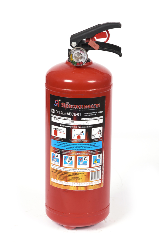 Огнетушитель порошковый закачной ОП-2(з)-ABCE-01, ЯРПОЖИНВЕСТ, масса заряда ОТВ - 2,0±0,1 кг., продолжительность подачи ОТВ не менее 6 с., длина струи ОТВ не менее 2 м., масса заряженного огнетушителя 3,2 кг.