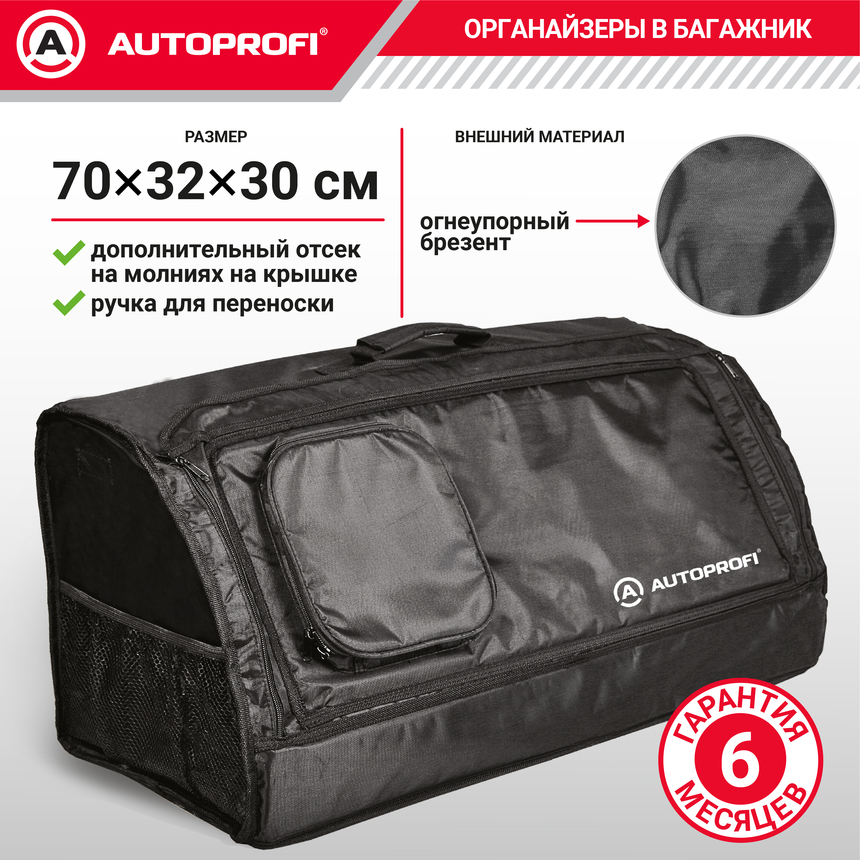 Черный органайзер в багажник. Внешняя сторона из огнеупорного брезента, внутри — ковролин. На крышке дополнительный отсек на молниях. Есть ручка для переноски. Органайзер пригоден для хранения инструментов, компрессора, принадлежностей для охоты и рыбалки. Размер 70х32х30 см.